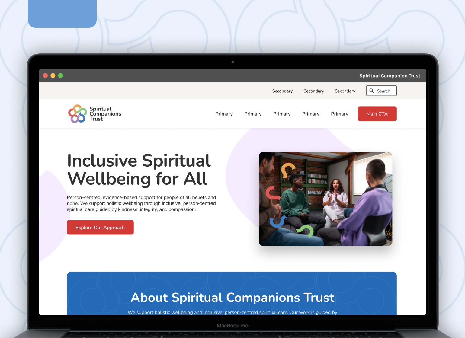 Before the rebuild, we developed a fresh visual identity for the Trust: a new logo, colour palette and typography that balance warmth, clarity and professionalism. Together, the brand and website now give Spiritual Companions a consistent digital identity and a flexible platform to grow programmes, expand reach and communicate purpose with confidence.